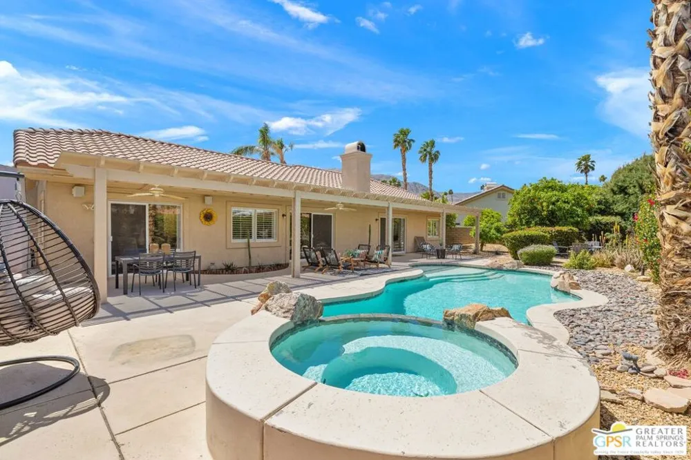 Welcome to this exceptional home in the desirable White Sun Estates, where contemporary style meets ultimate comfort. This beautifully upgraded property is perfect for those seeking a modern retreat with ample space, privacy, and stunning views. The open floor plan is highlighted by soaring ceilings, creating a light and airy atmosphere throughout. Enjoy the expansive great room featuring a gas fireplace, large living area, and two casual dining spaces, all seamlessly flowing into the chef's kitchen. The highly upgraded kitchen boasts sleek contemporary cabinetry, quartz countertops, a full suite of stainless steel appliances, and a large detached island with bar seating, making it perfect for both everyday living and entertaining. Step outside to your private backyard oasis the ultimate place to unwind. A covered patio, refreshing pool, and spa set the stage for outdoor living at its finest, complemented by breathtaking mountain views. The mature fruit trees, including orange, grapefruit, lemon, guava, and hybrid lemon/orange, add a special touch to this serene setting. The spacious primary suite features a vaulted ceiling, freshly installed carpet, and panoramic views of the backyard. It offers direct access to the patio, a large walk-in closet, and a luxurious en-suite bathroom with dual sinks, a walk-in shower, a separate tub, and a private water closet. Bedrooms Two and Three, located on the south side of the home, also boast mountain views and fresh carpeting, with easy access to the beautifully appointed hallway bath with a shower/tub combo. The home is as practical as it is beautiful, with a private walk-in pantry, a separate laundry room, and an attached three-car garage. Whether you're hosting guests or simply relaxing, this home's flow from the living areas to the outdoor spaces is nothing short of magical. Conveniently located near top restaurants, retailers, entertainment venues, hiking trails, and golf courses, this home truly offers the best of desert living. Don't miss out on the chance to call this stunning property your own!