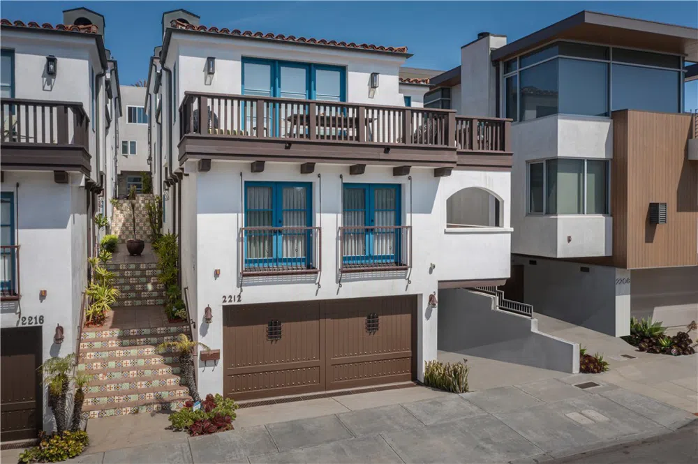 Indulge in coastal luxury at this exquisite Spanish-style townhouse, nestled in the desirable Sand Section of Manhattan Beach. Boasting four bedrooms (3 on one level) and three and a half baths within a spacious 2,600 square feet, this residence offers an unparalleled beachside experience. Revel in breathtaking ocean views from the expansive kitchen and living area on the top floor, and from the second floor primary suite and balcony. Ascend to the third floor and discover the heart of this Manhattan Beach gem, where a wrap-around balcony invites seamless indoor-outdoor living. The expansive, open-concept great room beautifully integrates the gourmet kitchen, dining and living areas, creating an ideal space for entertaining and relaxation. Tucked away under a charming Spanish archway, is an office nook and powder room. This level is designed for both grand entertaining and intimate moments, embodying the essence of sophisticated coastal living. The primary suite, along with two additional bedrooms, resides on the second level, providing a serene retreat. An en-suite 4th bedroom on the ground floor offers flexible living options. Enjoy rare Sand Section comforts; 3 car parking, central air, and a spacious laundry room. The primary bathroom is a spa-like sanctuary, featuring a dual-head tile shower and soaking tub. Elegant French doors open to a private patio on the street level, providing a private outdoor oasis, perfect for post surf/beach relaxing. Step outside to discover unique details like striking blue window frames that illuminate the crisp white facade. This residence blends classic architectural charm with modern elegance. Located a short block from the beach and a few blocks from Downtown MB, it is more than a home: It's a lifestyle.