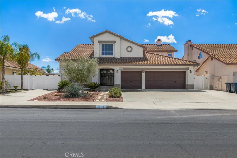 Spacious 5-Bedroom Wildomar Home with Pool, Spa & RV Parking. Welcome to 23115 Twinflower Ave, a beautifully updated 5-bedroom, 3-bathroom home in Wildomar with no HOA and low taxes. This two-story home features a bedroom and full bathroom downstairs, plus a bonus/office room, perfect for multi-generational living or a home office. For cozy winter nights, there is a gas fireplace in the family room and also one in the primary bedroom. The upgraded kitchen boasts granite countertops, a newer "smart", wifi-connected, 5-burner oven/range, stainless steel refrigerator, and a stainless steel microwave (all purchased in 2024). The home has been recently updated with new luxury vinyl plank (LVP) flooring and carpet (2024), a new HVAC system (2023), and a Quiet Cool whole-house fan for energy efficiency. Additional upgrades include a Nest thermostat, tinted windows, ceiling fans throughout, and automatic carriage lights on the garage. The three-car garage comes equipped with programmable garage door openers, a workbench and built-in storage cabinets. For added security, the home includes four exterior cameras and two motion-sensor lights. Step outside to your private backyard oasis, featuring a pool and spa (salt-ready, currently chlorine), both traditional gas heater and solar heating for the pool, and a covered patio—perfect for entertaining. The vinyl fencing, low-maintenance landscaping, and stunning hill views enhance the outdoor space. For those with toys or tools, this property offers RV/boat parking with a 30-amp outlet and included pool and garden sheds. Conveniently located near freeways, shopping, and dining, this home is move-in ready! Don’t miss this incredible opportunity—schedule your showing today!