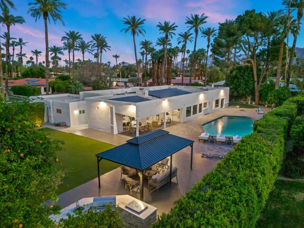 Ultra-Private Rancho Mirage Gem on over half an acre! Located in the highly coveted Tamarisk area of Rancho Mirage, this updated 5BD/5BA home sits on a rare 23,522 SF corner lot. Built in 1956, the 3,701 SF mid-century home blends timeless design with fabulous contemporary upgrades--including a $100,000 Italian-made custom kitchen that seamlessly complements the home's architectural character. The vaulted and light-filled great room is enhanced by a modern glass rock fireplace and clean architectural lines. Large tinted picture windows elevate the dining experience with views of the expansive back yard, pool, and mountains. The gracious primary suite includes an enclosed retreat--perfect for a home office, private gym, or creative studio. A cozy bedroom/bath casita offers comfortable guest accommodations, while an attached apartment-style suite with private entry, living/bedroom combo, bath, and a bonus room makes for an ideal extended stay or live-in option. The ultra-private backyard is a resort-style escape with lush landscaping, mountain views, an oversized Pebble Tec pool, spa with water feature, gazebo, and an outdoor kitchen. An abundance of outdoor lighting creates the perfect setting for nighttime enjoyment and entertaining. Additional highlights include citrus trees, a putting green, and a large artificial turf area for kids, pets, sports--or even the addition of a guest house. Leased solar is a huge energy-efficiency bonus. This is a true Tamarisk area treasure offering luxury, flexibility, and the quintessential Rancho Mirage lifestyle!