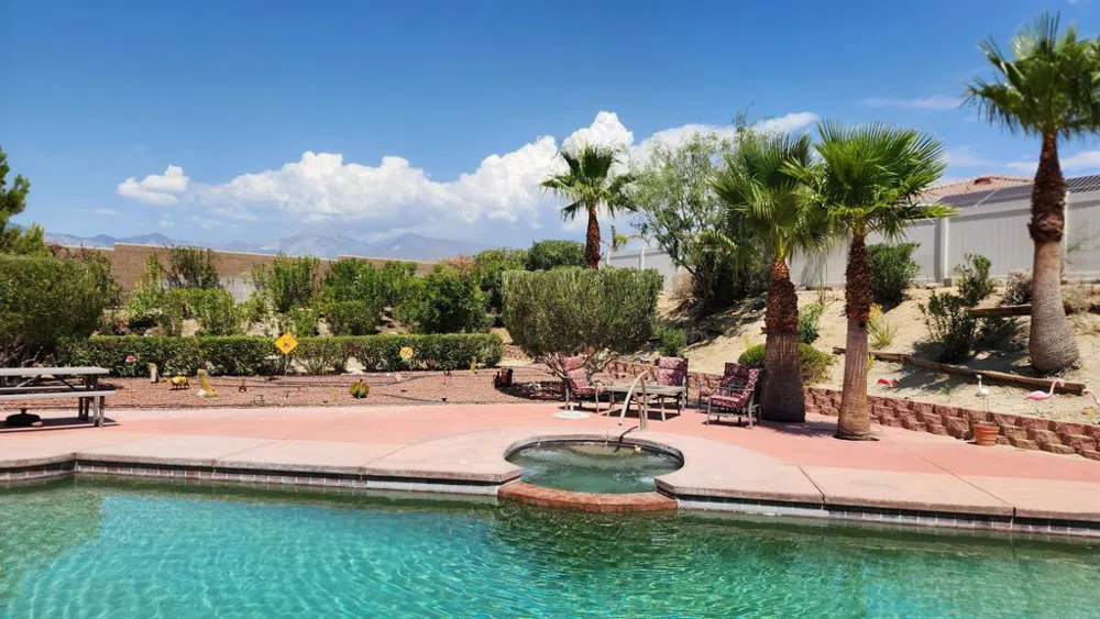 Wow, get a lot for your money on this one! One of the largest homes, sits on one of the largest lots in the community (over 15k sq. ft.) Has OWNED SOLAR and Also provides gated RV parking as well as a 2 car finished garage and oversized driveway. This nicely landscaped Backyard has a very large pool and spa, patio cover, large permanent shed, and spectacular views. Both AC units were replaced in 2022. One of the larger homes with huge kitchen with dark wood cabinets, white tile counters and large pantry. Raised bar allows for additional seating. The additional room off kitchen has option to be used as office, media room, dining, bedroom, you choose! 3 other bedrooms and 2 baths. Flooring is tile in living areas and carpet in bedrooms. 2 primary bedrooms with Large walk in closet in both. Gated community has Low HOA dues and amenities like pools, spas, tennis courts.