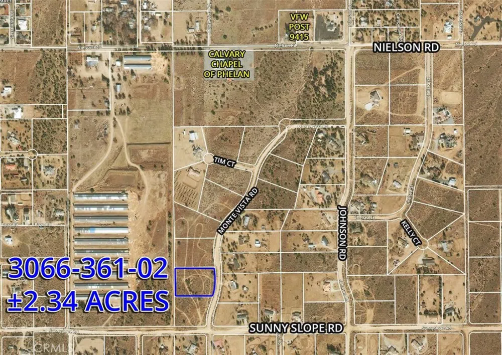 APN 3066-361-02 is a rectangular parcel on the west side of Monte Vista Road, north of Sunny Slope Rd. There are existing homes with power established across the street, buyer verify. Multiple Rural Residential Lots For Sale in the beautiful rural area of Phelan, San Bernardino County, CA. Enjoy spacious parcels with plenty of room for private, quiet living in an established rural neighborhood. Views of distant mountains to the south make this a desirable place to have a home. Quick access to grocery, conveniences and schools.