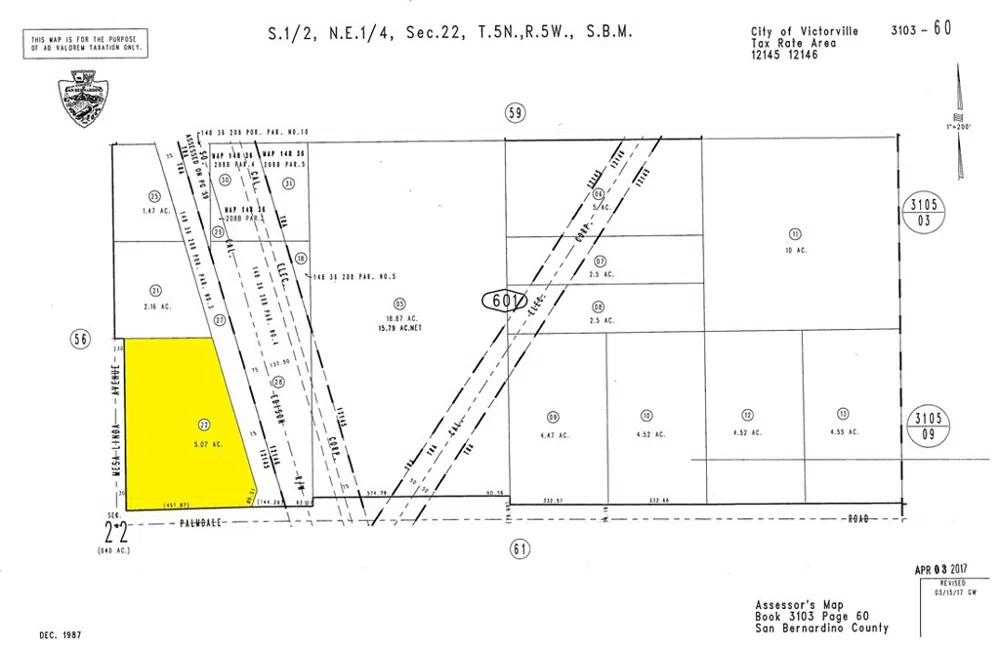 Two contiguous parcels available (3103-601-21 & 3103-601-22) must be sold together. Parcel 3103-601-21, 2.16 acres, zoned Residential. Parcel: 3103-601-22, 5.07 acres, zoned commercial that allows for all permitted Neighborhood Retail activities. Utilities are in the street. Property is on the corner of Palmdale Rd/ Hwy 18 and Mesa Linda Ave. Land is walking distance from Starbucks, Rite Aid, banks, restaurants, and other major shopping centers. Buyer and buyers agent to verify utility and zoning information with the proper agencies.